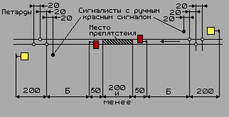 Работники железной дороги, ограждающие съемные ремонтные вышки, путевые вагончики и другие съемные подвижные единицы, а также работники, руководящие передвижением съемных единиц, должны быть снабжены, кроме переносных щитов, ручных флагов и сигнальных фонарей, петардами и духовыми рожками для подачи сигналов о приближении поезда, а также сигналов для остановки поезда, если это потребуется.